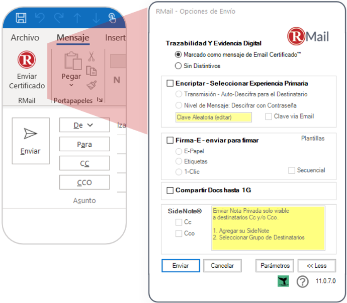 RMail™ se instala en tu plataforma de correo electrónico existente. Al seleccionar la opción Enviar Certificado, podrás enviar tus correos electrónicos con funciones avanzadas, como grabado, firma electrónica y muchas más.
